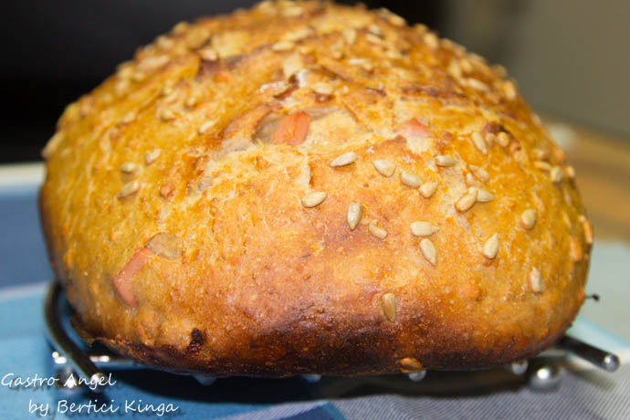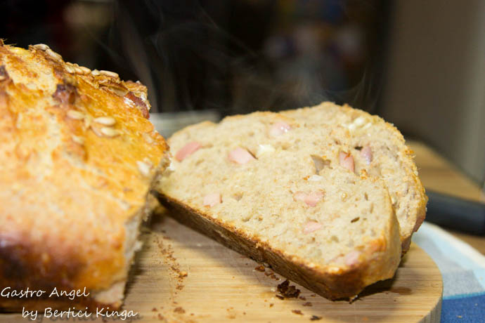 Se amestecă toate ingredientele și se frământă timp de 10 minute, după care se adaugă șunca și cașcavalul. Se lasă la dospit 40 de minute. Se așează în vasul de copt și se mai lasă încă 40 de minute la dospit. Se presară cu semințe și se dă la cuptor încins la 230 de grade timp de 30-40 de minute.