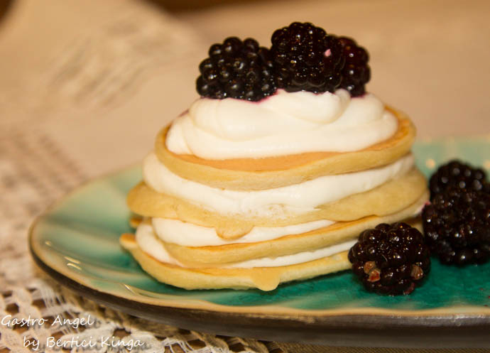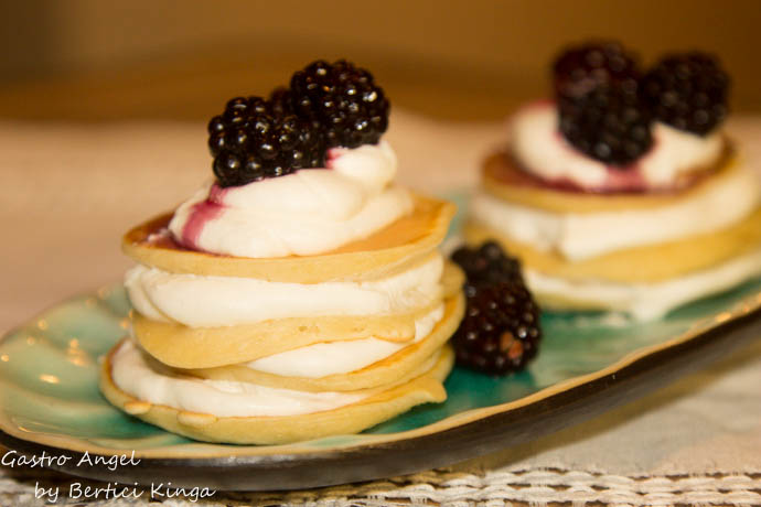 Pentru cremă se bate frișca și se amestecă cu mascarpone. Se așează într-un dui și se întinde pe plăcintuțe. Se ornează cu mure.