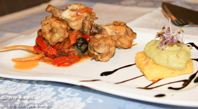 Puiul se marineaza la rece o ora cu vinul, cu ghimbirul razuit, cu sarea, piperul si putin tabasco.Legumele se taie lunguiete.Intr-o tigaie se incinge ulei de masline si bucatile de pui se prefrig, apoi se adauga zeama marinata si putin vin alb. Se calesc pana se moaie, daca este necesar se completeaza cu apa. Se pun legumele si se mai calesc impreuna. La sfarsit se condimenteaza.