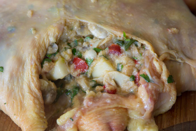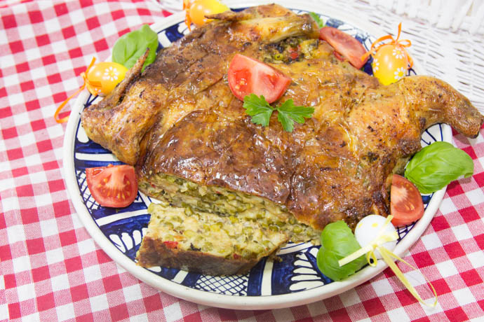 Spalam puiul si-l verificam de puf si pene. Calim ceapa in putin ulei si adaugam si mazarea fearta. Painea inmuiam in lapte. Celalalte ingrediente taiem cubulete si adaugam si ouale crude. Omogenizam umplutura si condimentam. Condimentam si puiul.