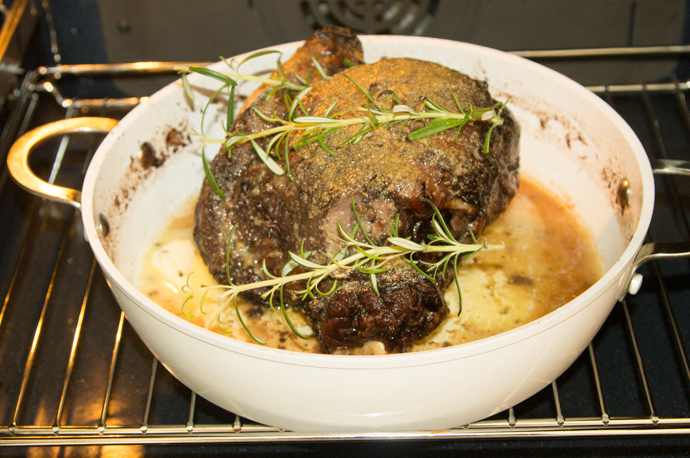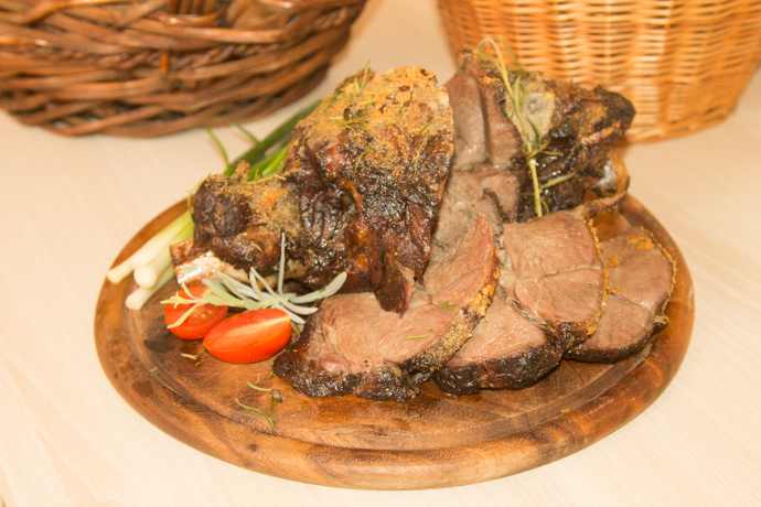 Pulpa de miel se condimenteaza bine cu cele de sus, in afara de uleiul de trufe care se lasa la sfarsit, apoi se stropeste cu coniac, vin si ulei. Se pune la frigider pentru 24 ore (se poate lasa si mai mult). A doua zi se scoate din frigider si se prajeste in putin ulei pe fiecare parte, se lasa sa stea 5 minute, apoi se pune in cuptorul preincalzit la 130 grade pentru 2 ore in folie si se toarna peste condimentele. Se scoate din cuptor, se scurge zeama si se stropeste cu uleiul de trufe, se pun ramurile de rozmarin si se mai pune in cuptor pentru 40 minute la 180 grade. Carnea se lasa sa se odihneasca, apoi se feliaza.
