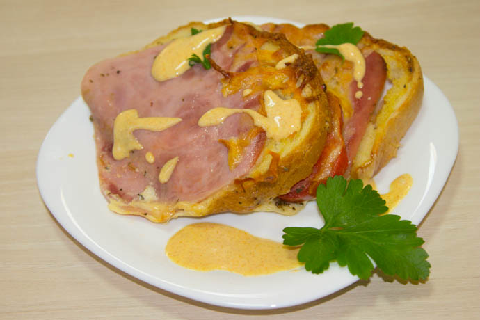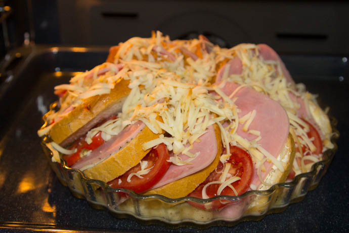 Untul se întinde pe feliile de pâine, după care se așează câte o felie din fiecare îngredient pe pâinea cu unt. Feliile de pâine se așează pe o tavă în formă rotundă, asemenea unui tort. Se bat ouăle cu laptele, se toarnă pe sandvișuri și se presară cu cașcaval. Se dă la cuptor încins la 180 de grade până se rumenesc.