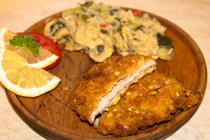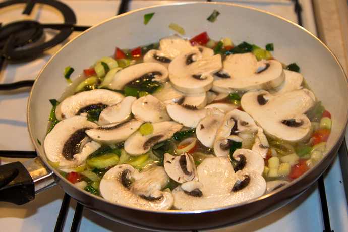 Se prajeste ceapa, adaugam ciupercile si orezul spalat. Se prajeste pana se albeste, apoi adaugam vinul si apa. Se fierbe pana orezul este fiert. La sfarsit se adauga parmezanul.