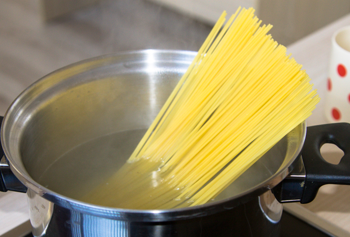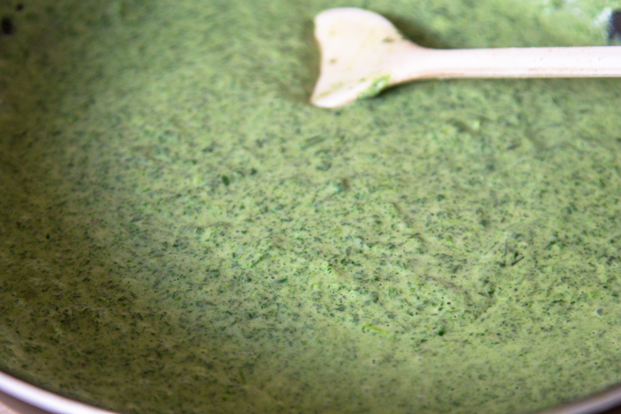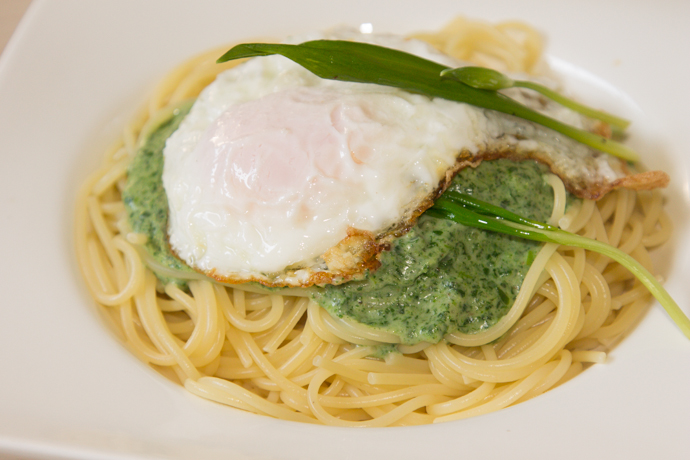 Fierbem spagettele in apa cu sare. Oparim spanacul si urzica. In unt prajim faina, facem un sos besamel, adaugam ceapa si turnam laptele. Frunzele oparite adaugam in sos, apoi condimentam si turnam si smantana. Componentul mixam fin. Prajim oul deasupra.(ochi de ou)