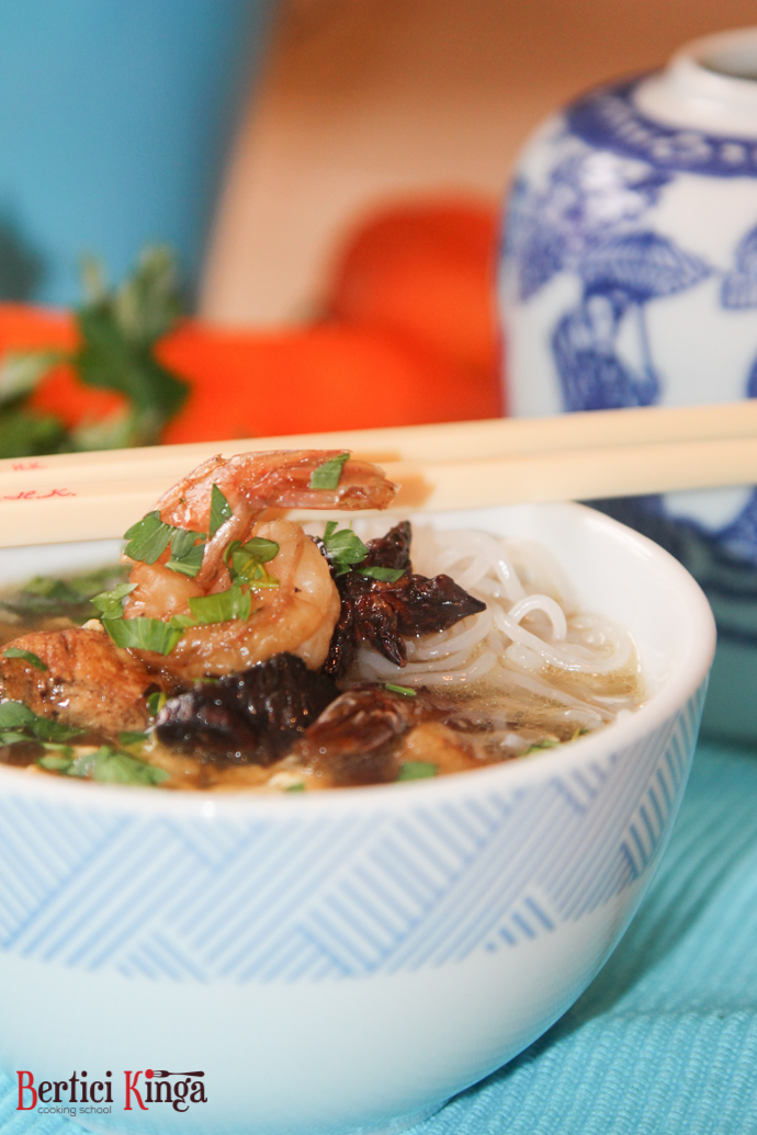 200 g piept de pui, 200 g creveți, 50 g paste de orez, 20 g ciuperci shitake, 5 cm praz, 2 ouă, 1