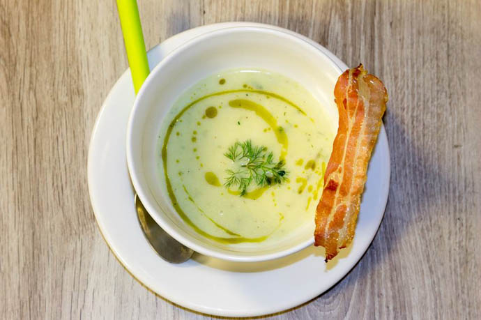 Se topește untul într-o tigaie, se adaugă prazul tocat, usturoiul și ceapa. Se amestecă timp de 5 minute, după care se adaugă cartofii tăiați cubulețe. Se condimentează cu sare și piper, se acoperă cu un capac și lasă pe foc timp de 5 minute. Se subțiază cu supa de legume și se lasă pe foc până la primul clocot, după care se ia de pe foc și se omogenizează cu mixerul. Se adaugă crème fraîche și se mai lasă pe foc timp de 3-5 minute.