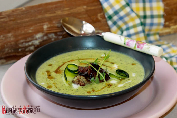 Untul se topește într-o tigaie, apoi se adaugă prazul tocat. Se amestecă timp de 5 minute, după care se adaugă dovlecelul tăiat cubulețe. Se condimentează cu sare și piper și se prăjește. Când dovlecelul s-a înmuiat, se subțiază cu apă și se lasă pe foc până la primul clocot. Se ia jos de pe foc, se toacă cu mixerul. Se pune înapoi pe foc, se subțiază cu crème fraîche și se fierbe încă 3-5 minute. Se ornează cu cârnaț prăjit.