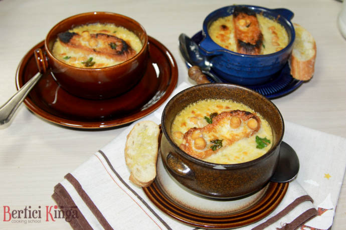 Se călește ceapa și usturoiul, se adaugă morcovul, pasta tahini și se condimentează după gust. Se subțiază cu laptele și se fierbe timp de 10 minute, după care se zdrobește cu mixerul. dacă compoziția este prea groasă, se mai adaugă puțin crème fraîche și se mai lasă pe foc până la primul clocot. Se servește în bol. Pâinea se prăjește, se pune în bol se presară cu cașcaval și dă la cuptor până cașcavalul se topește.
