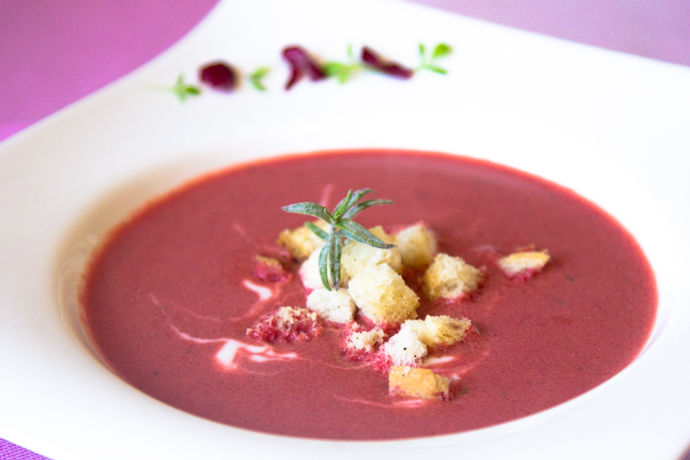 Sfecla se prăjește la cuptor în folie de aluminiu. Legumele se prăjesc în ulei. Se adaugă sfecla prăjită, curățată și tăiată cubulețe. Se subțiază cu supa de porc. I se dă un clocot apoi se adaugă iaurtul. Se condimentează. La sfârșit se adaugă puțin oțet balsamic.