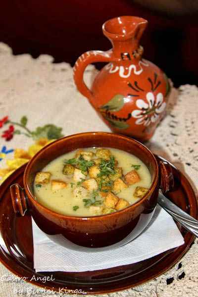 După primul clocot, se omogenizează cu turmixul, se condimentează și se mai fierbe puțin. Se servește cu pâine prăjită în ulei de măsline cu usturoi. Se presară cu cașcaval ras.