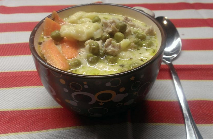 Legumele, mazărea și carnea se prăjesc în puțin ulei timp de 5 minute. Se ia de pe foc și se îngroașă cu amestecul obținut din omogenizarea a 2 linguri de făină cu laptele și smântâna. Atenție ca amestecul să nu rămână cu cocoloașe. Se condimentează, se subțiază cu apă, după care se pune înapoi pe foc. Din când în când se amestecă. Se prepară găluștele din 2 ouă și 4 linguri de făină. Se taie găluștele în supă. După primul clocot, se reduce focul și se fierbe în continuare aproximativ 30 de minute.