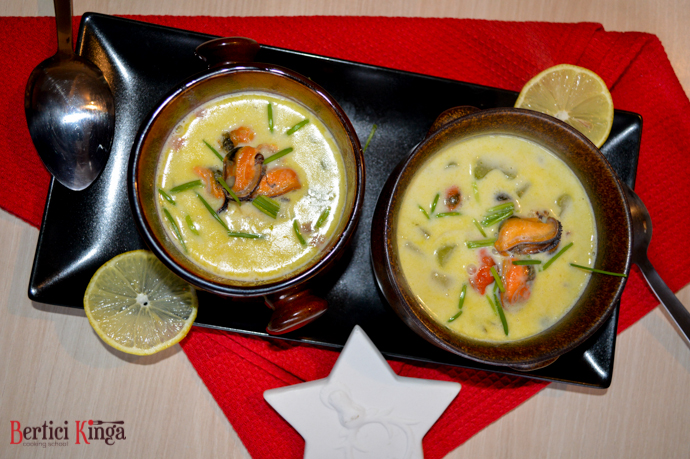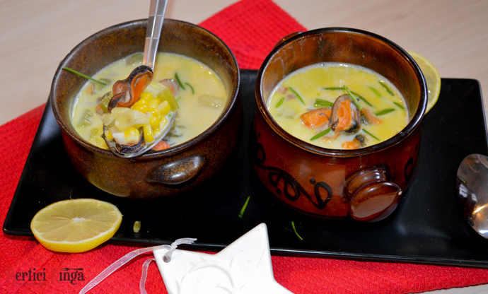 1 ceapă, 2 căței usturoi, 50 g bacon, 5 cm țelină, 100 g cartofi, 100 g porumb, 100 g carne de scoici, 100 ml crème fraîche, sare, piper, nucșoară, zeamă de lămâie