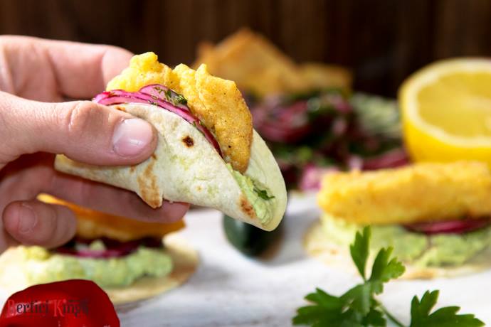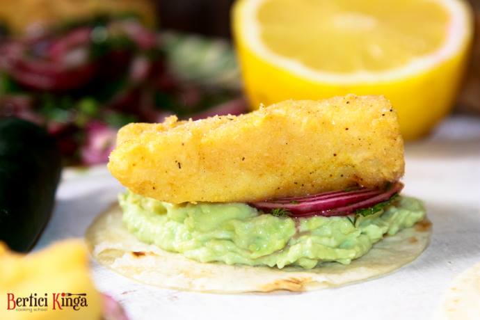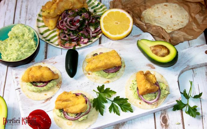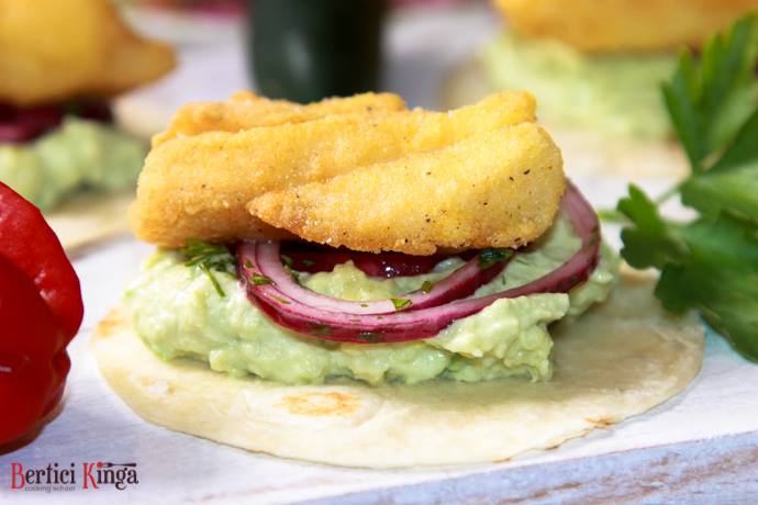 Se încălzesc feliile de tortilla. Se zdrobește avocado, după care se amestecă cu smântâna, cu puțină zeamă de lămâie și sare. Ceapa se lasă câteva minute în saramură cu verdețurile și oțetul. Se așează întrun bol cele două feluri de făină, chili, sare și curcuma. Se trec feliile de pește prin această compoziție, după care se prăjesc în ulei. Foile de tortilla se ung cu puțină cremă de avocado, se acoperă cu compoziția cu ceapă, peste care se așează peștele.